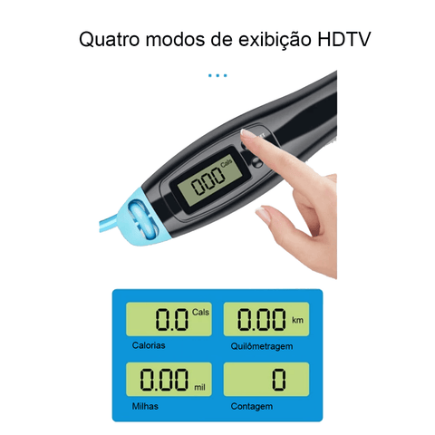 Ele possui um temporizador integrado que permite contar calorias e saltos.